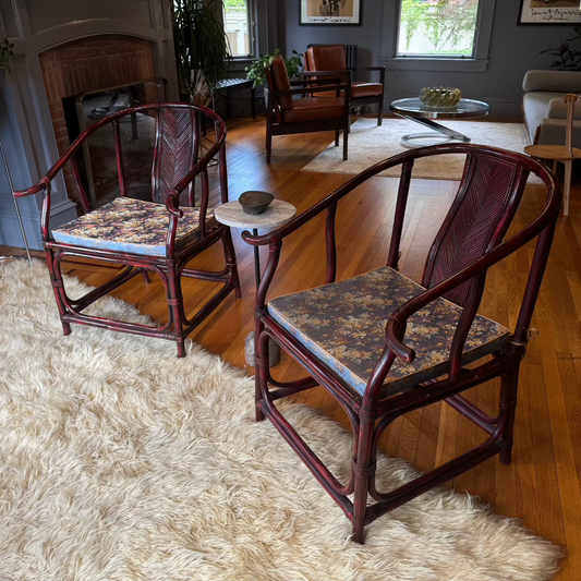 Vintage Chinoiserie Horseshoe Chairs with Blue Floral Satin Cushion (c.1970s)