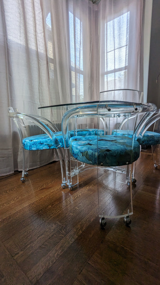 Vintage Blue Floral Lucite Chairs (set of 4) + Table