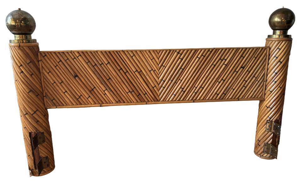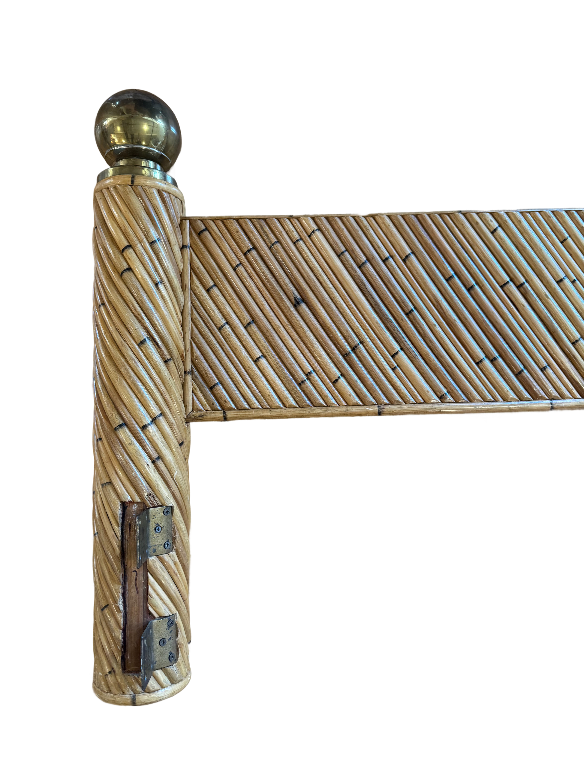 Fabulous 1980s Italianate queen size panel bed frame with brass finials attributed to Marcello Mioni. The bamboo pieces are affixed in a chevron pattern to the sturdy wood walls of the frame. A brass orb sits atop each corner.