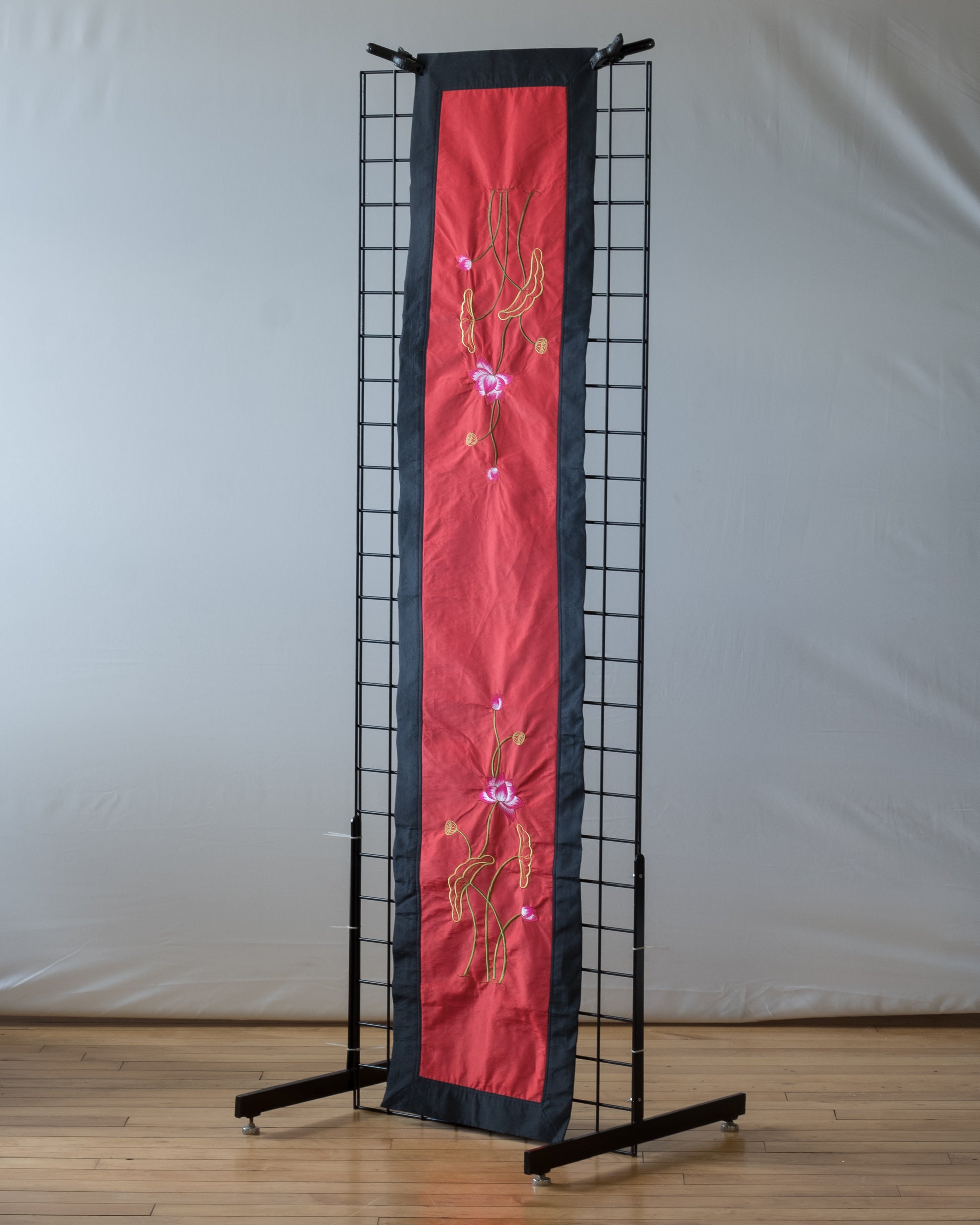 A beautiful red silk table runner embroidered with lotus flowers gives a unique twist on a floral motif. Done in a chinoiserie style, the black silk border delivers bold elegance.