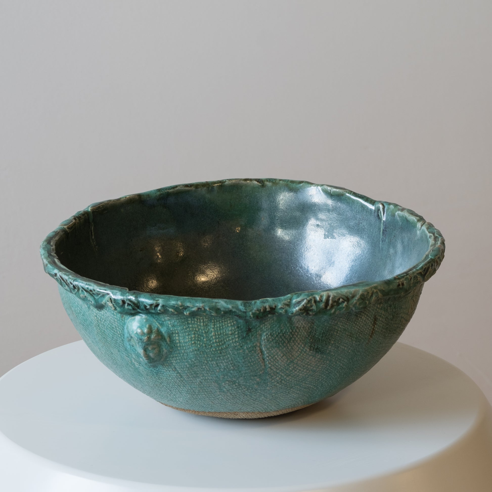 This handmade bowl is a stunning turquoise with a burlap texture on the exterior. It has two small molded faces on the sides. Signed by an unknown artist.