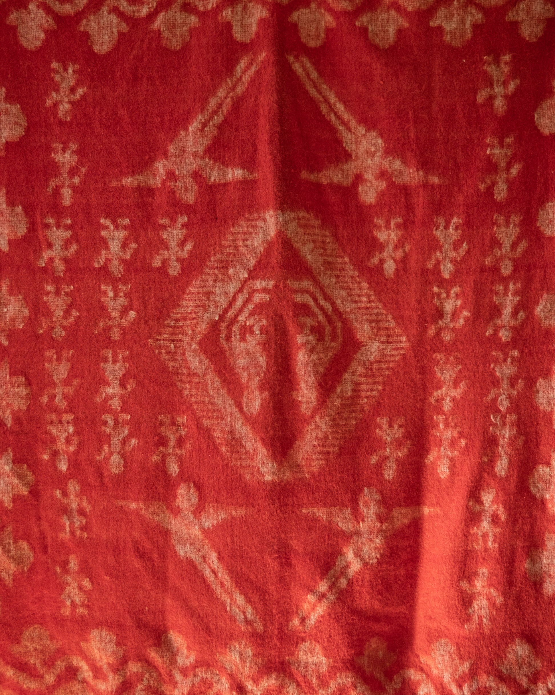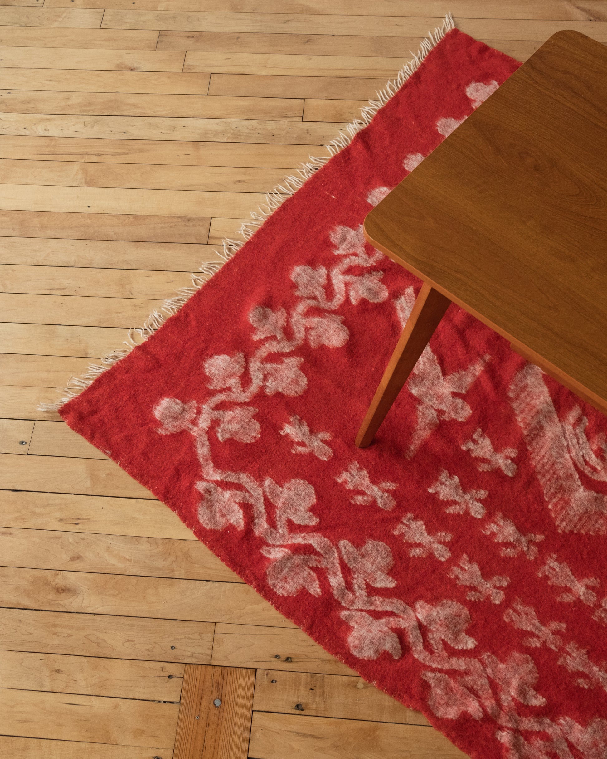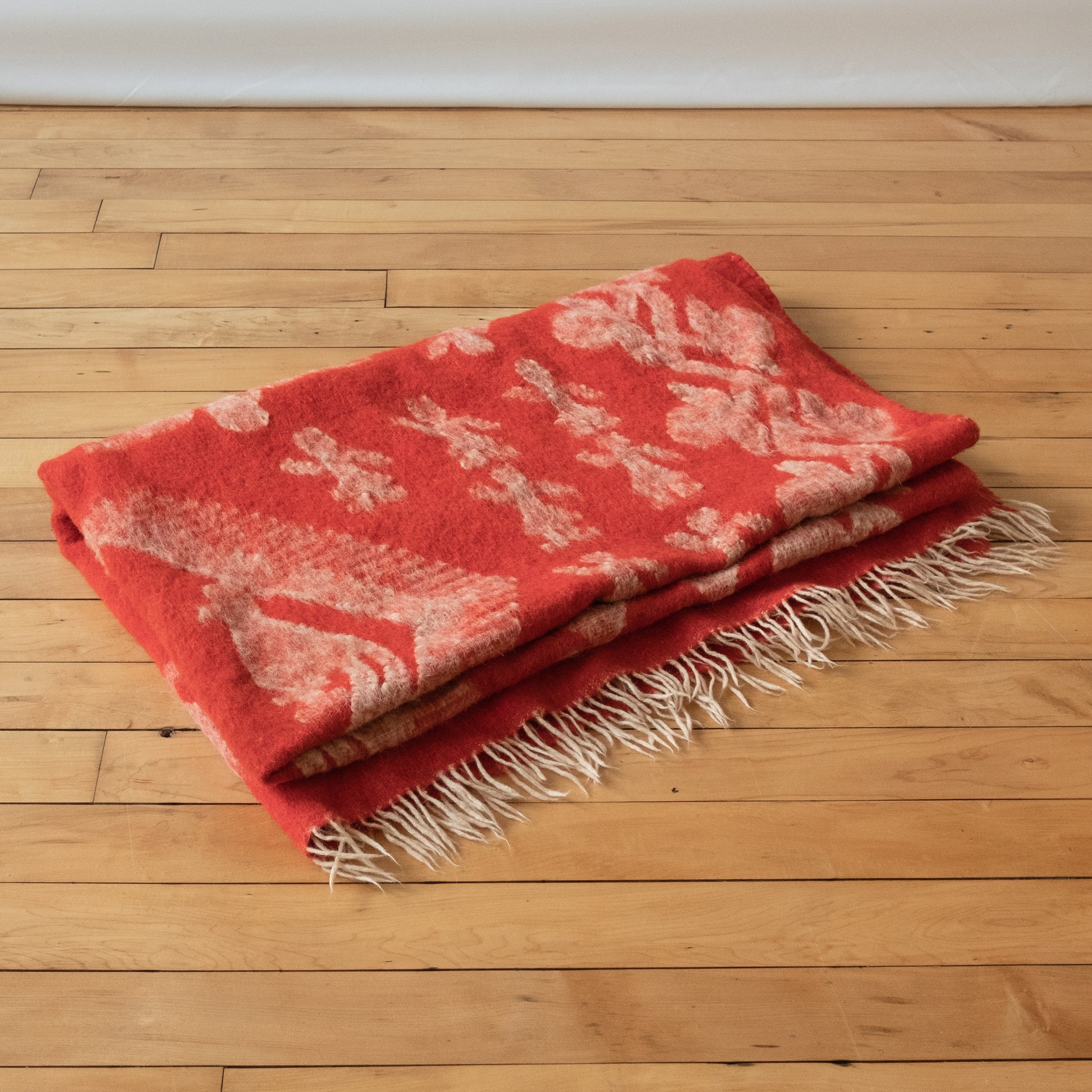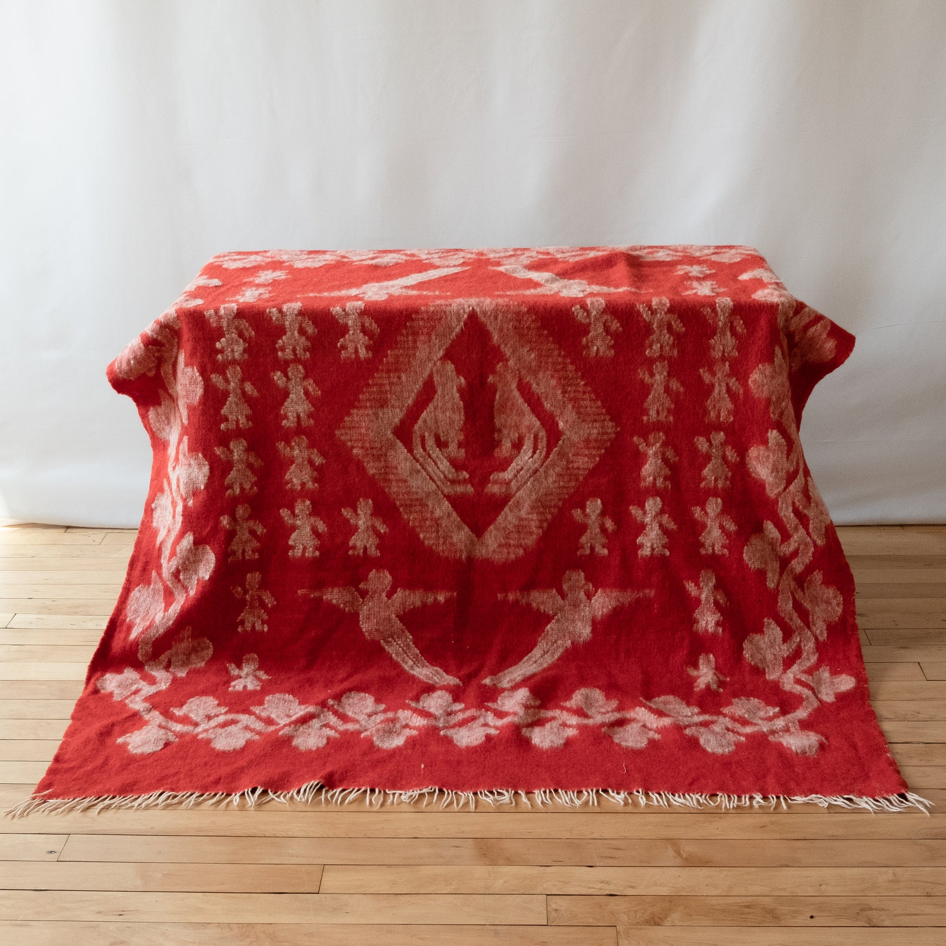 Fantastically on theme, this cherry red wool blanket features a motif of birds - possible phoenixes or parrots- in motion. Surrounded by flowers and figures tufted in white, this combination of color and shapes is mesmerizing. A twisted cream fringe provides additional depth. The maker and origin is unknown. This would be amazing draped over your favorite chair or scattered at the end of your bed for a color pop.