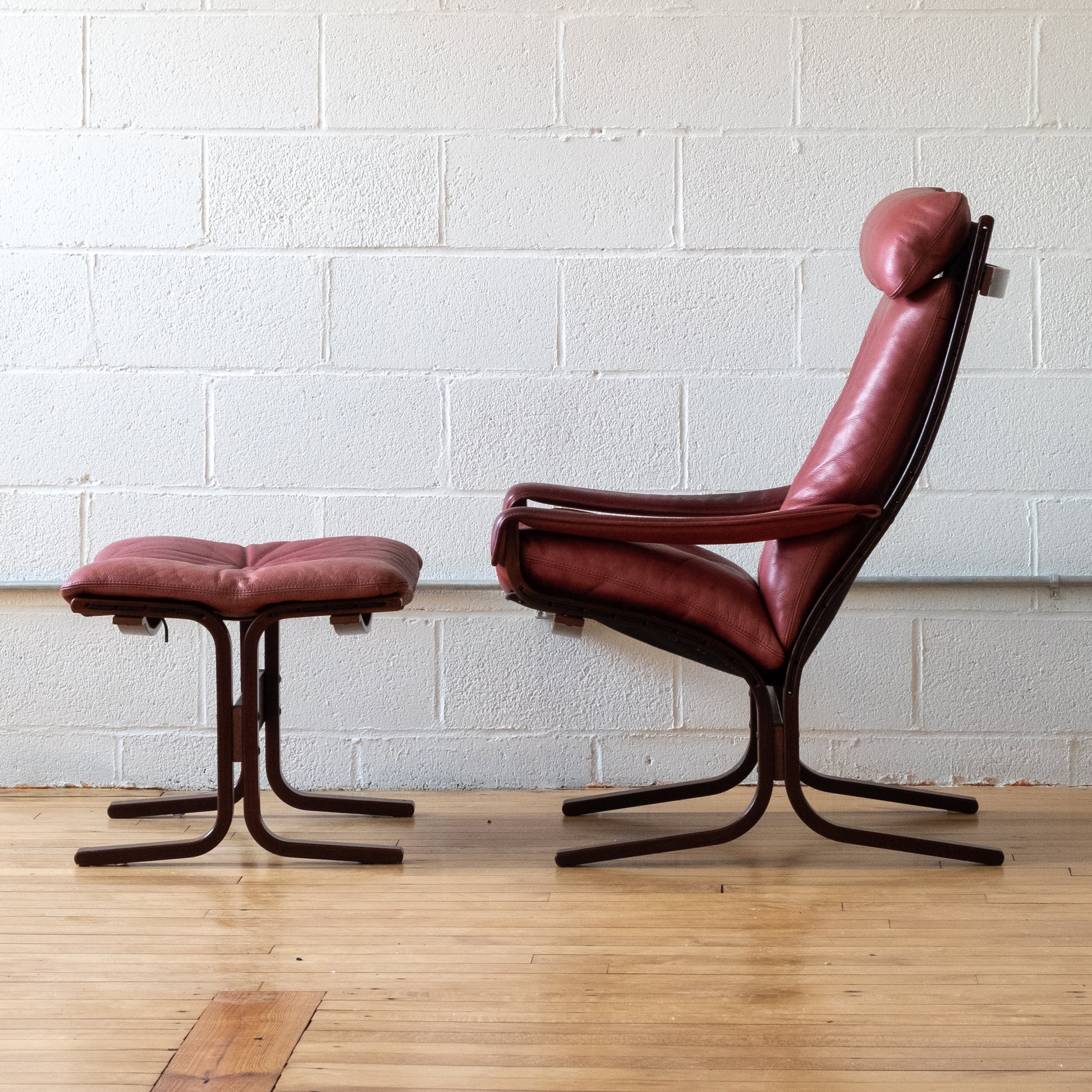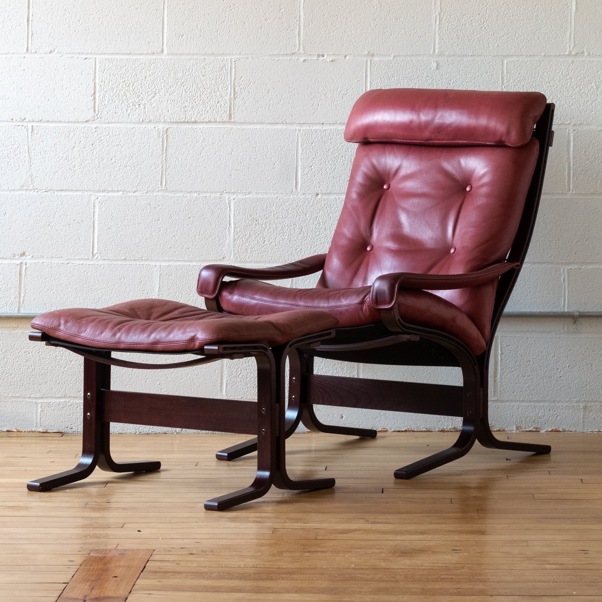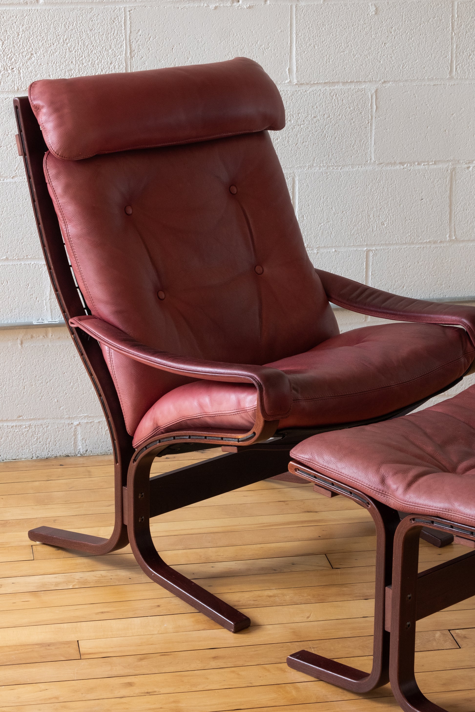 This ultra comfortable classic "Siesta" lounge chair and ottoman will have you lounging in style. Clad in a rich rouge leather with walnut stained frames & red color designed by Ingmar Relling and made in Norway by Westnofa. This award winning chair has a walnut stained cantilevered bentwood frame and rouge leather cushions that sit on a canvas sling. It's increasingly difficult to find both the chair and ottoman together. Bring a single set into your reading room or outfit a lounge area with the pair.