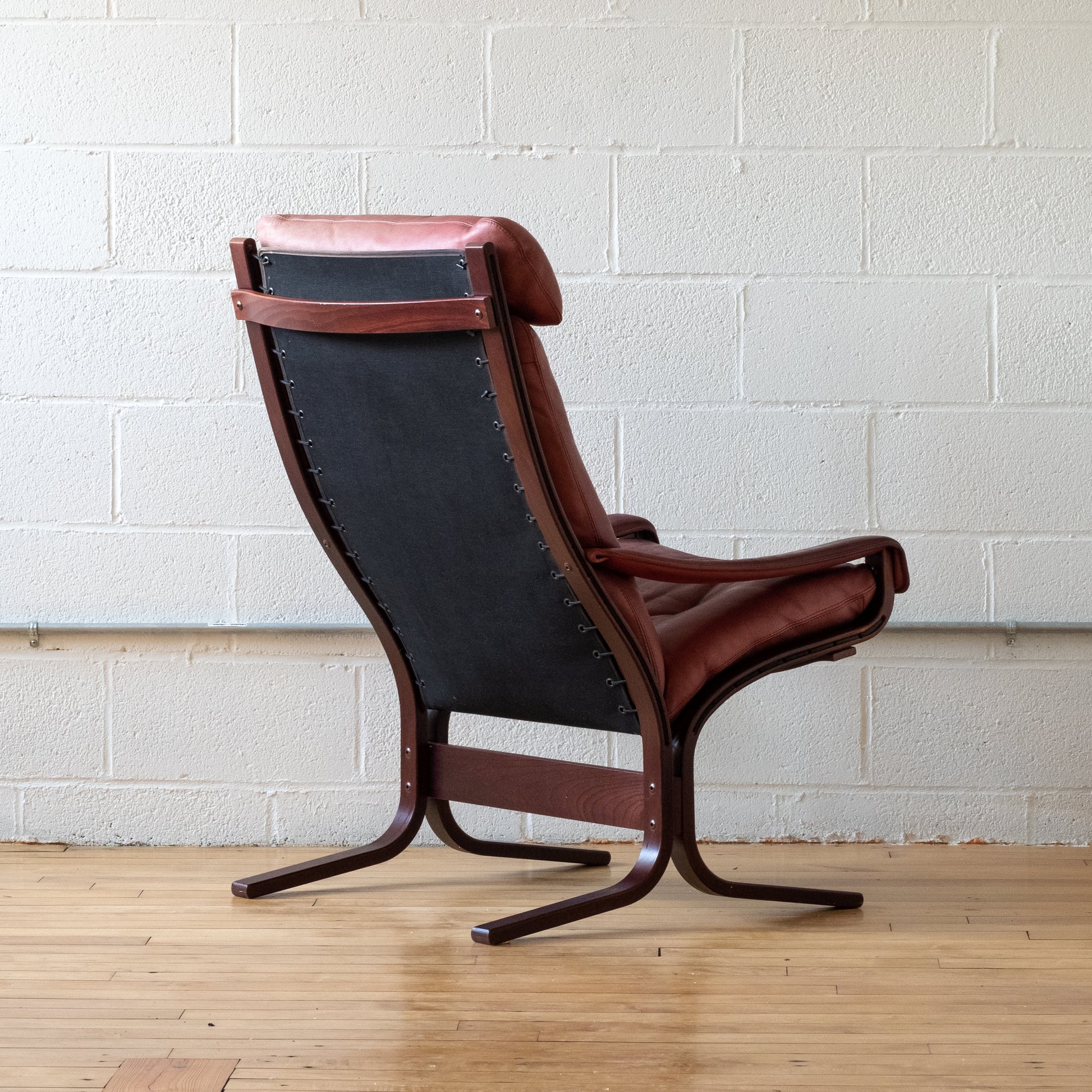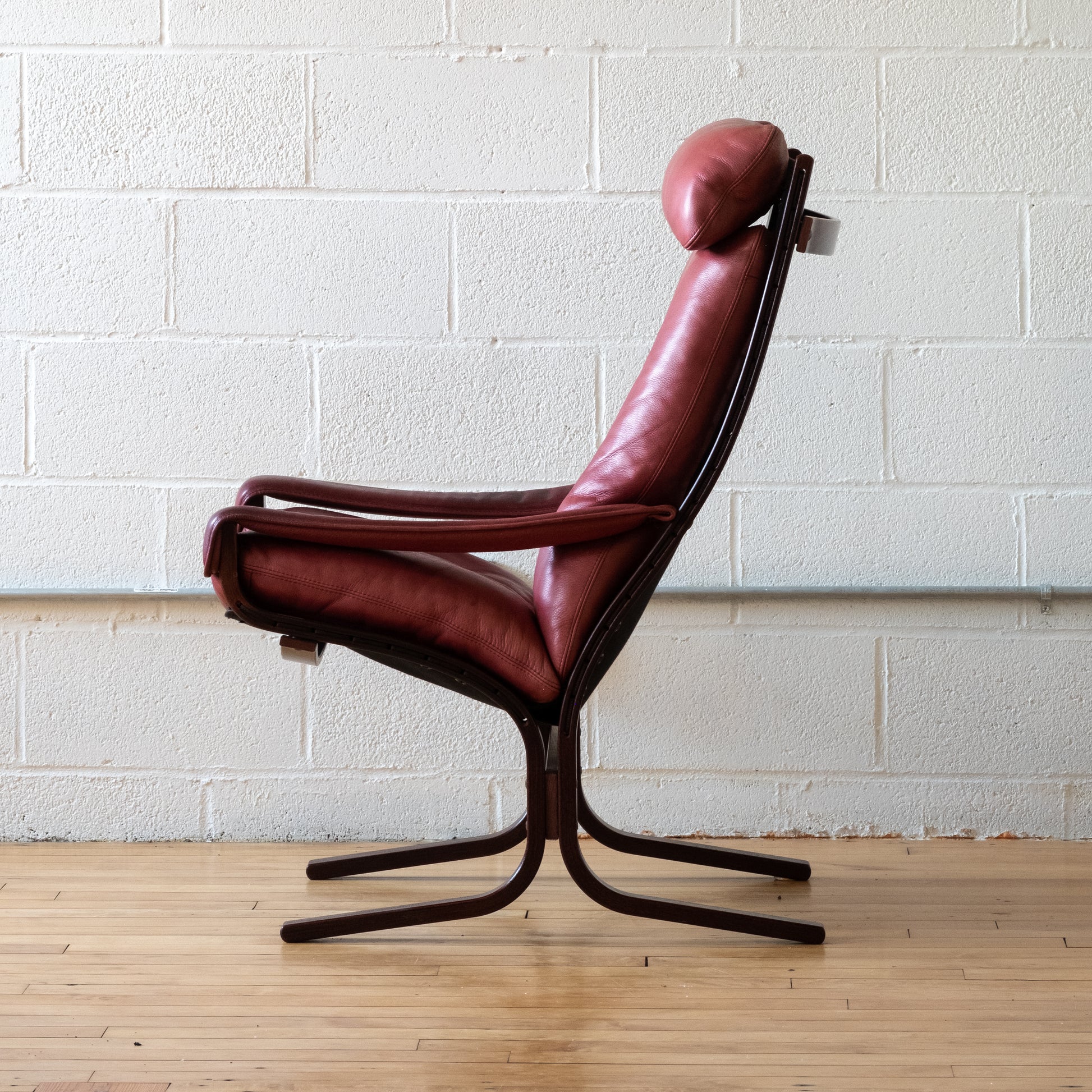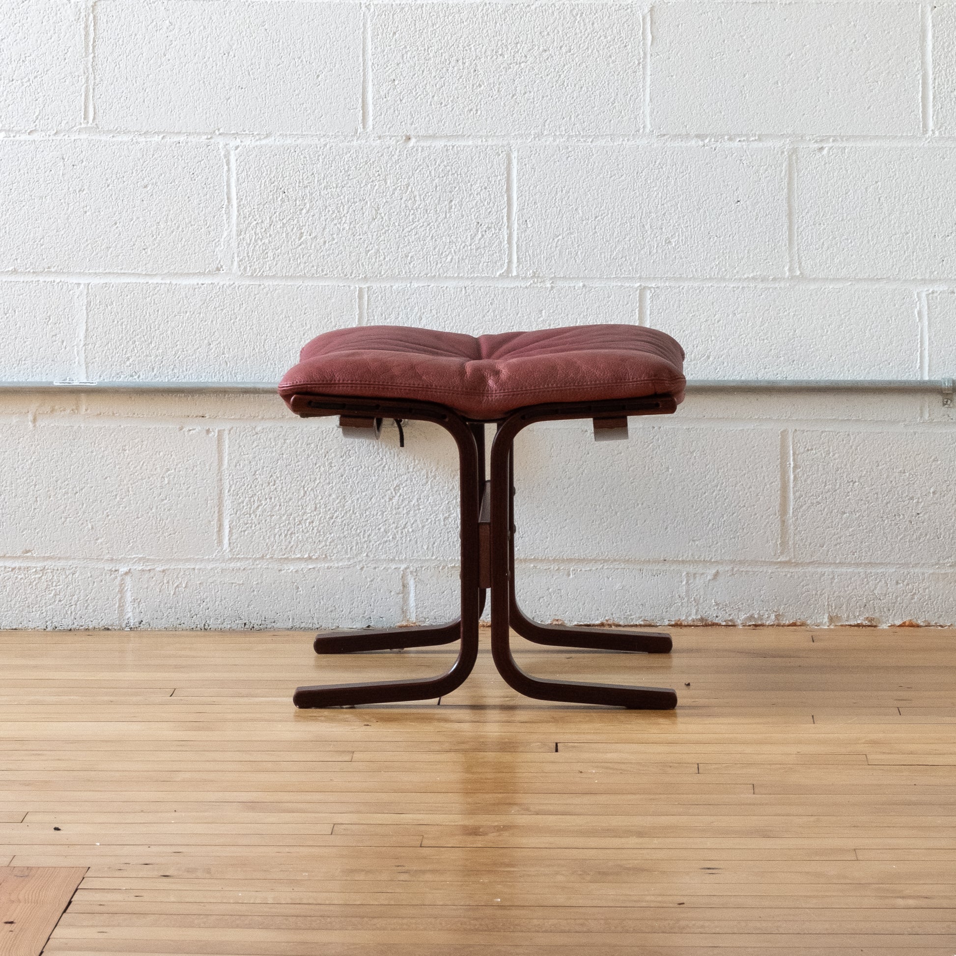 This ultra comfortable classic "Siesta" lounge chair and ottoman will have you lounging in style. Clad in a rich rouge leather with walnut stained frames & red color designed by Ingmar Relling and made in Norway by Westnofa. This award winning chair has a walnut stained cantilevered bentwood frame and rouge leather cushions that sit on a canvas sling. It's increasingly difficult to find both the chair and ottoman together. Bring a single set into your reading room or outfit a lounge area with the pair.